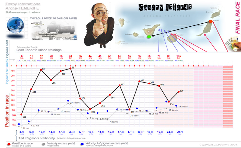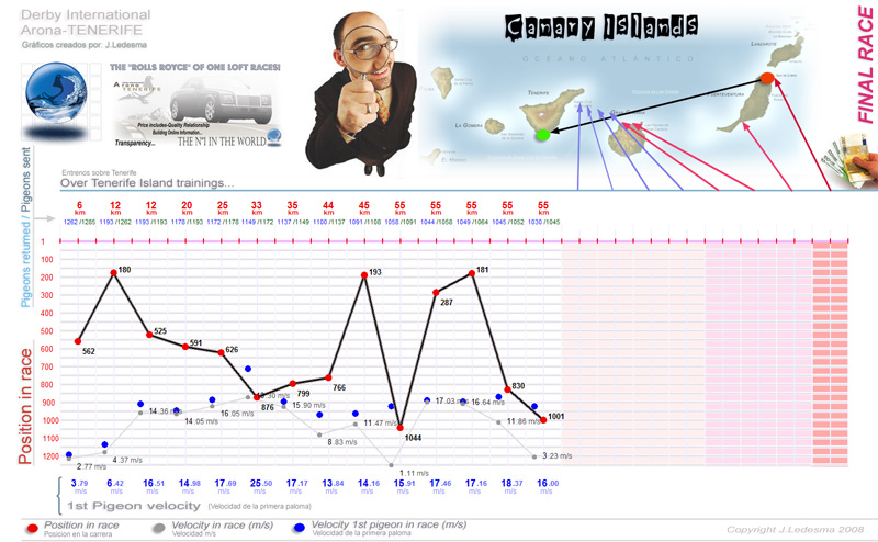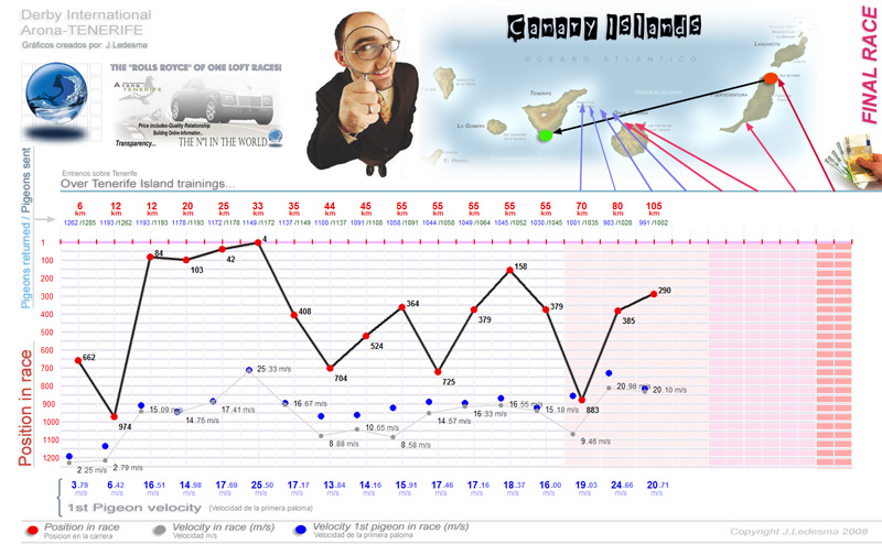 | Date / Time (Fecha / Hora) | Race (Concurso) | Arrival (Llegada) | Time / Speed (Tiempo / Vel) | Pigeon sent (Soltadas) | Classification | WD | WS | TE | Sky (Cielo) |