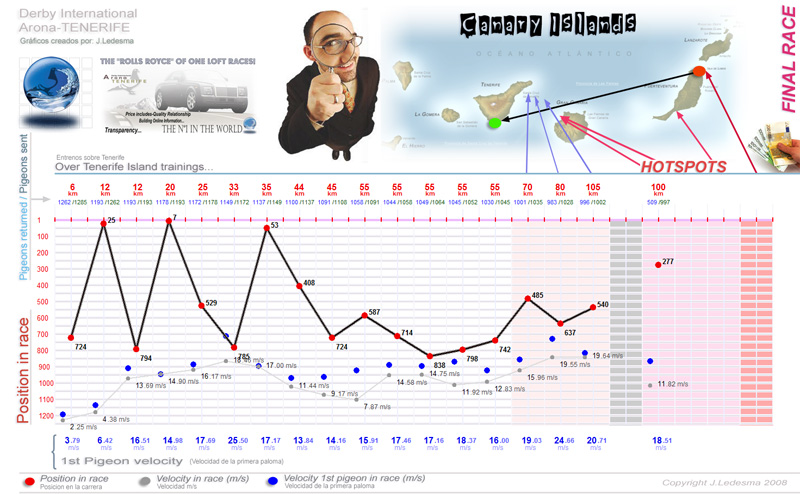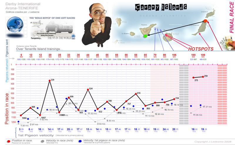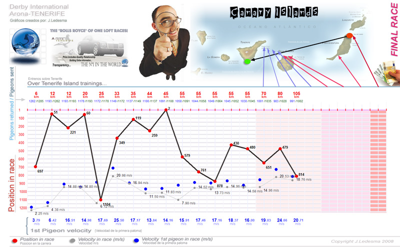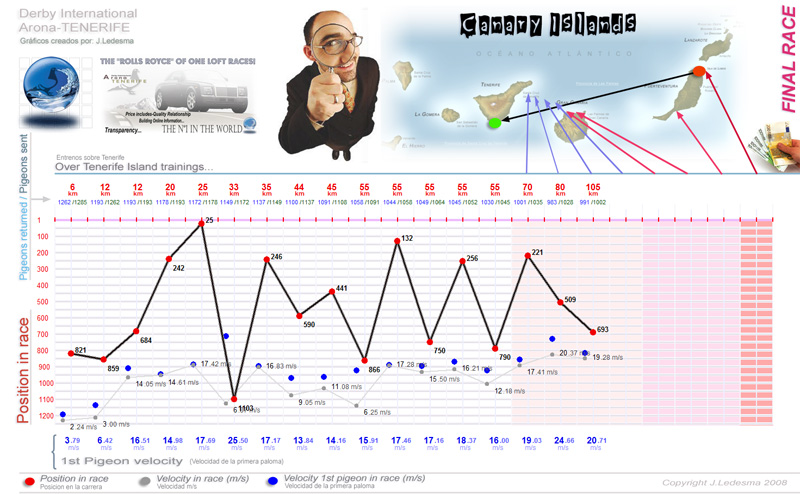 | Date / Time (Fecha / Hora) | Race (Concurso) | Arrival (Llegada) | Time / Speed (Tiempo / Vel) | Pigeon sent (Soltadas) | Classification | WD | WS | TE | Sky (Cielo) |