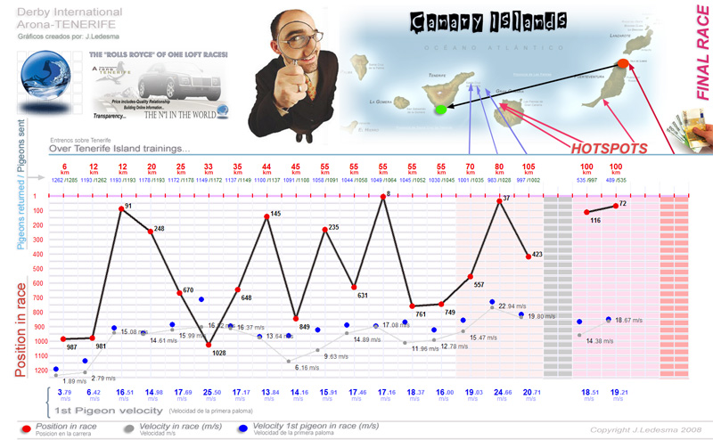 | Date / Time (Fecha / Hora) | Race (Concurso) | Arrival (Llegada) | Time / Speed (Tiempo / Vel) | Pigeon sent (Soltadas) | Classification | WD | WS | TE | Sky (Cielo) |