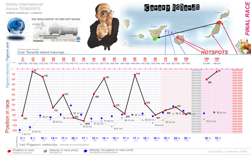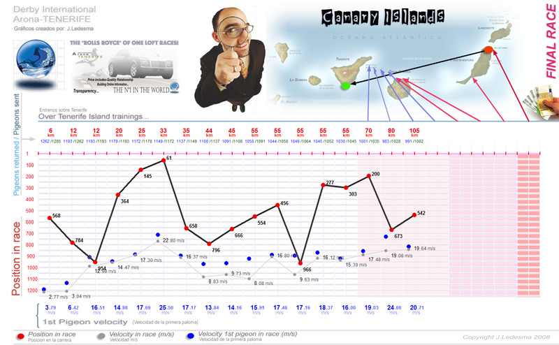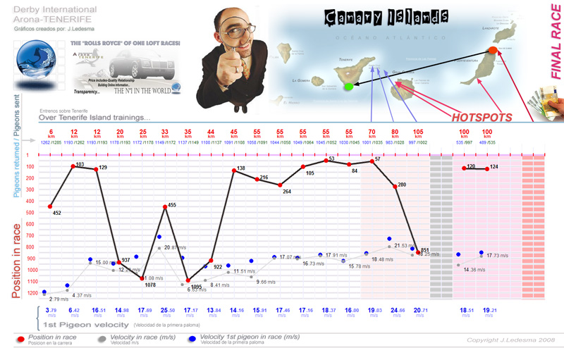 | Date / Time (Fecha / Hora) | Race (Concurso) | Arrival (Llegada) | Time / Speed (Tiempo / Vel) | Pigeon sent (Soltadas) | Classification | WD | WS | TE | Sky (Cielo) |