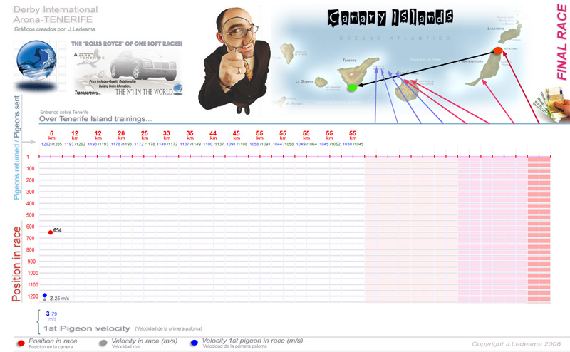 | Date / Time (Fecha / Hora) | Race (Concurso) | Arrival (Llegada) | Time / Speed (Tiempo / Vel) | Pigeon sent (Soltadas) | Classification | WD | WS | TE | Sky (Cielo) |