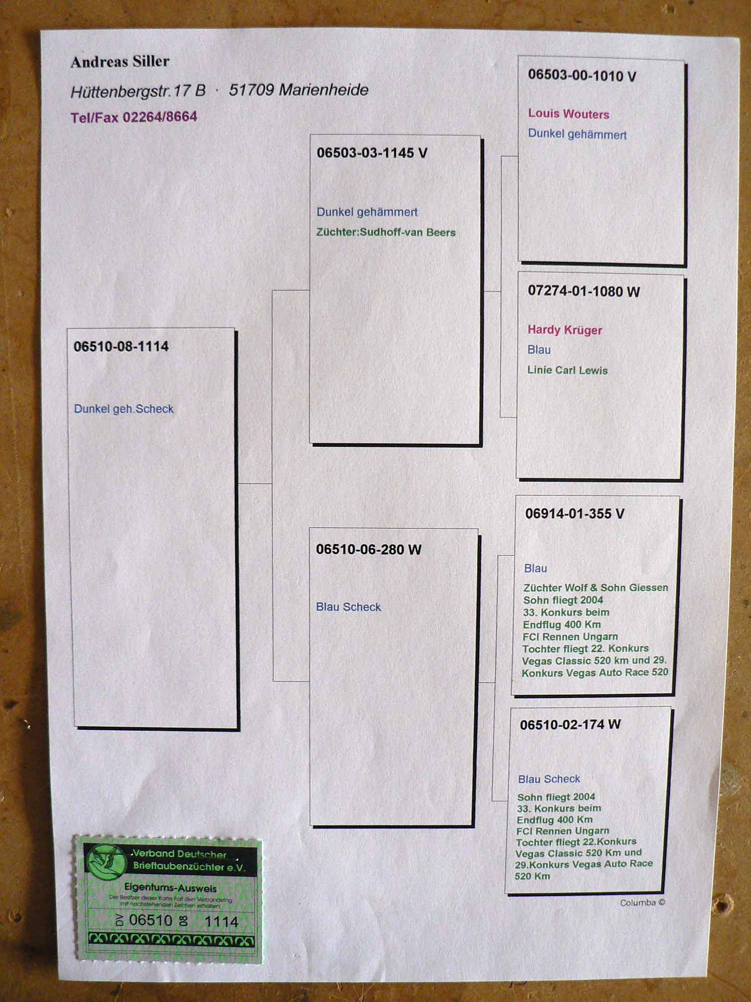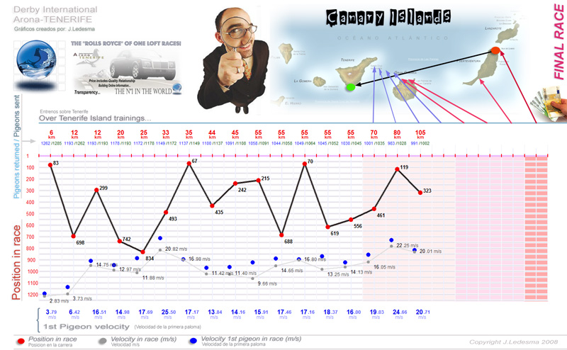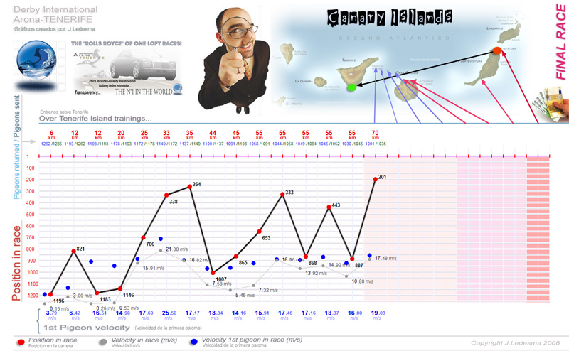 | Date / Time (Fecha / Hora) | Race (Concurso) | Arrival (Llegada) | Time / Speed (Tiempo / Vel) | Pigeon sent (Soltadas) | Classification | WD | WS | TE | Sky (Cielo) |