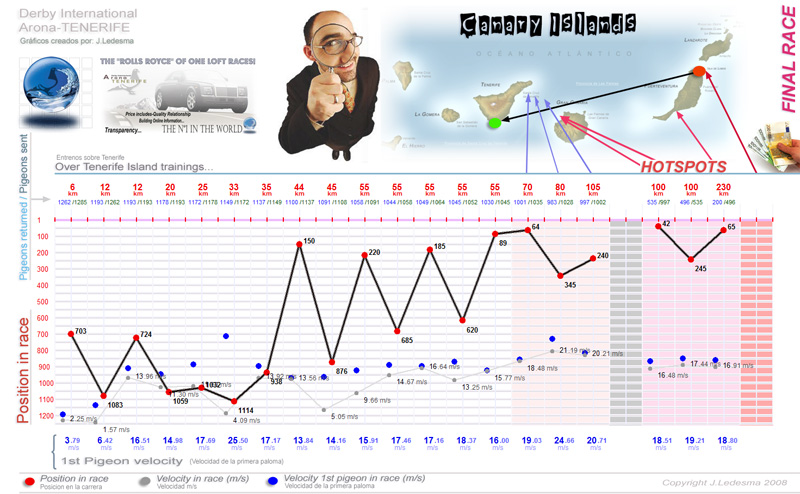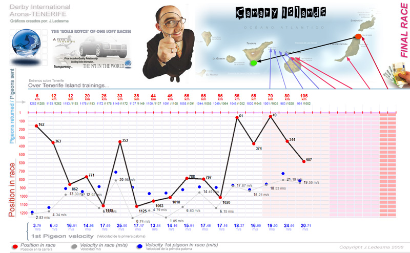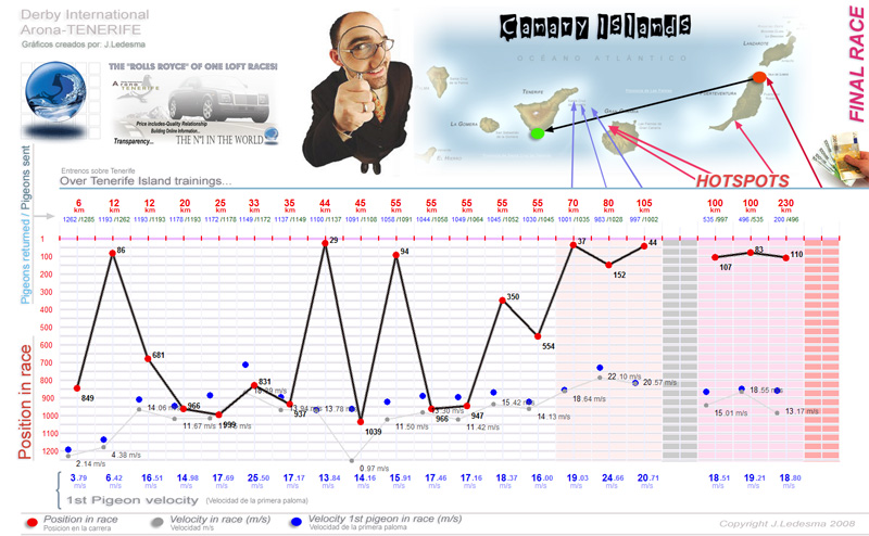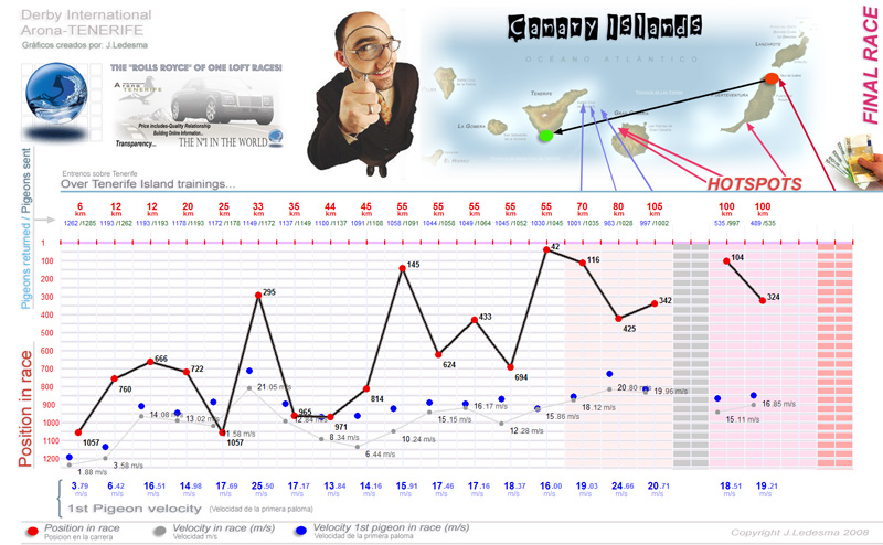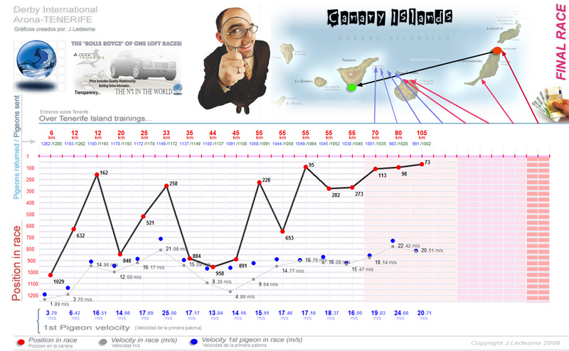 | Date / Time (Fecha / Hora) | Race (Concurso) | Arrival (Llegada) | Time / Speed (Tiempo / Vel) | Pigeon sent (Soltadas) | Classification | WD | WS | TE | Sky (Cielo) |