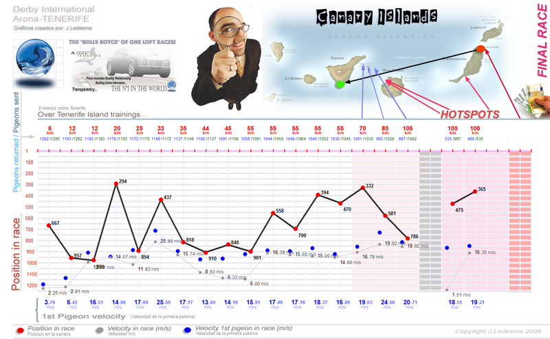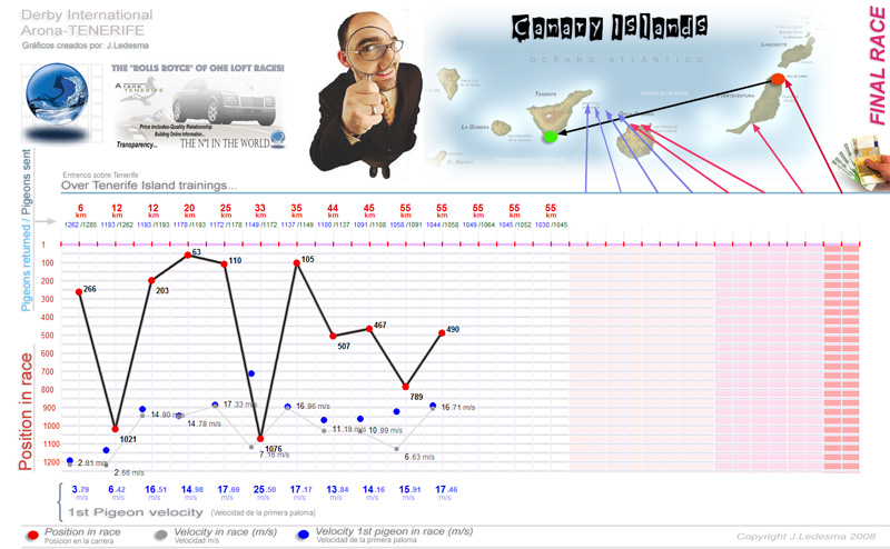 | Date / Time (Fecha / Hora) | Race (Concurso) | Arrival (Llegada) | Time / Speed (Tiempo / Vel) | Pigeon sent (Soltadas) | Classification | WD | WS | TE | Sky (Cielo) |