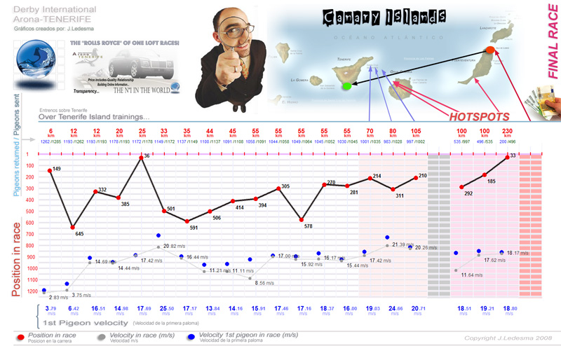 | Date / Time (Fecha / Hora) | Race (Concurso) | Arrival (Llegada) | Time / Speed (Tiempo / Vel) | Pigeon sent (Soltadas) | Classification | WD | WS | TE | Sky (Cielo) |
