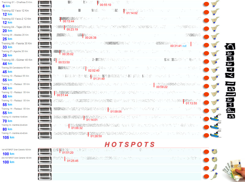 | 21/03/09[08:00:00] | 2nd HOTSPOT Gran Canaria 100 Km | 09:25:45 | 01:25:45 = 1120 m/m | 535 | 72 | NNE | 25Km/h | 19º |
