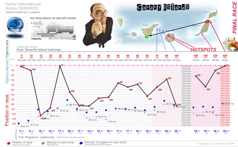 | Date / Time (Fecha / Hora) | Race (Concurso) | Arrival (Llegada) | Time / Speed (Tiempo / Vel) | Pigeon sent (Soltadas) | Class. | WD | WS | TE | Sky (Cielo) | Score |