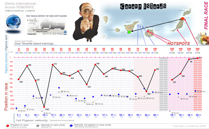| Date / Time (Fecha / Hora) | Race (Concurso) | Arrival (Llegada) | Time / Speed (Tiempo / Vel) | Pigeon sent (Soltadas) | Class. | WD | WS | TE | Sky (Cielo) | Score |