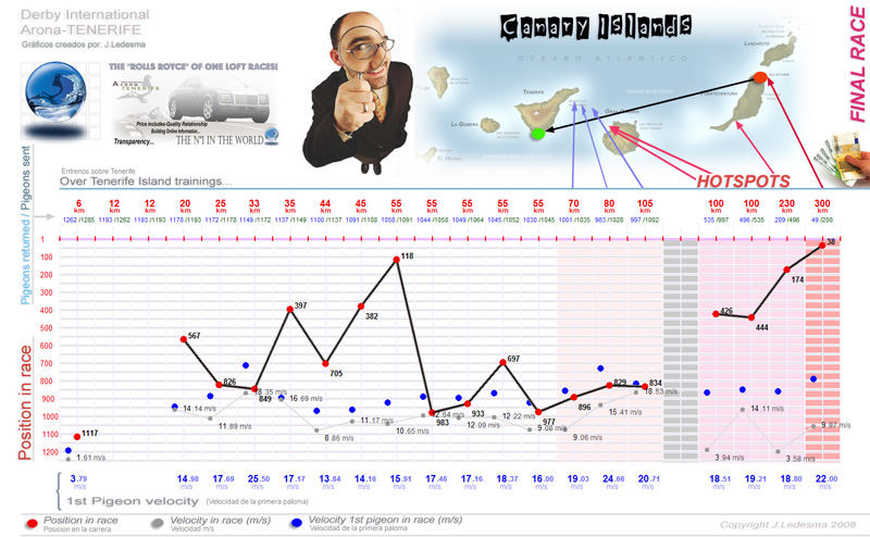 | Date / Time (Fecha / Hora) | Race (Concurso) | Arrival (Llegada) | Time / Speed (Tiempo / Vel) | Pigeon sent (Soltadas) | Class. | WD | WS | TE | Sky (Cielo) | Score |