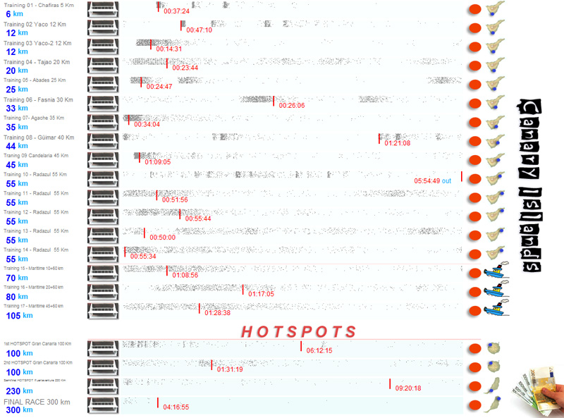 | 21/03/09[08:00:00] | 2nd HOTSPOT Gran Canaria 100 Km | 09:31:19 | 01:31:19 = 1052 m/m | 535 | 212 | NNE | 25Km/h | 19º |