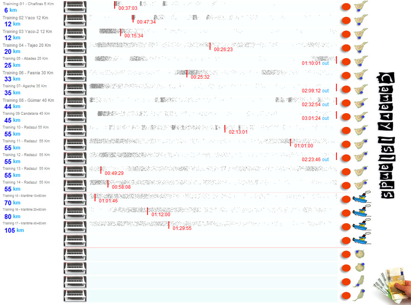 | 05/02/09[12:00:00] | Traning 09 Candelaria 45 Km | 08:58:36 | 03:01:24 = 63 m/m | 1108 | 1018 | W | 26Km/h | 18º |