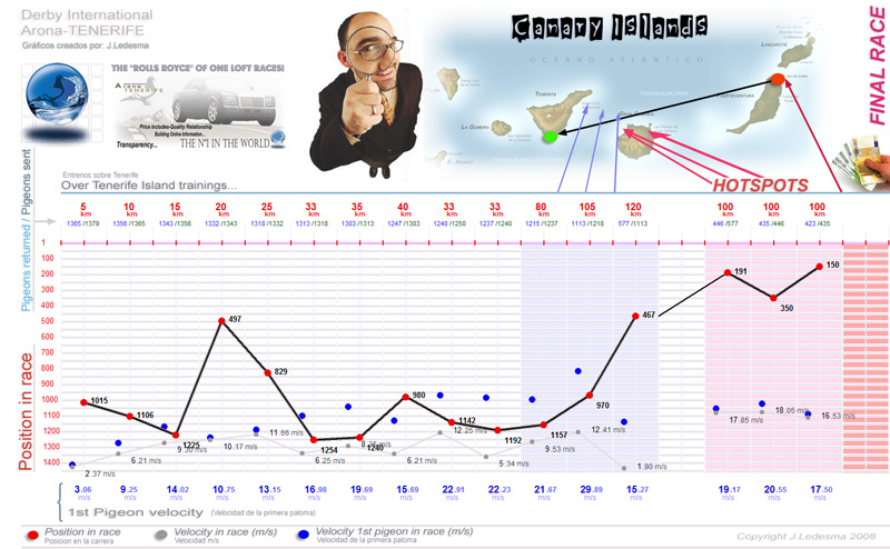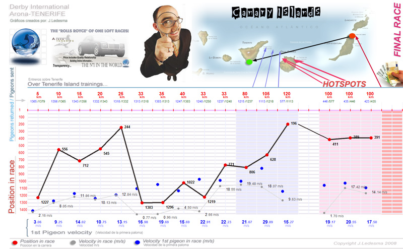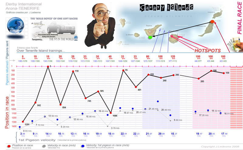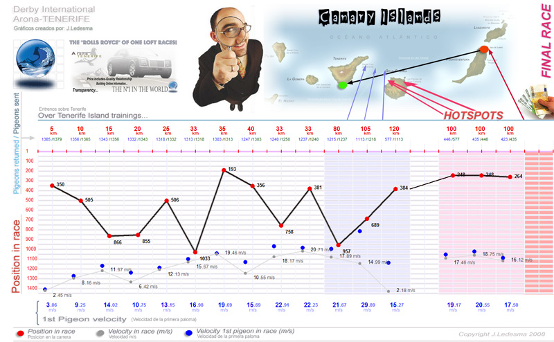 | Date / Time (Fecha / Hora) | Race (Concurso) | Arrival (Llegada) | Time / Speed (Tiempo / Vel) | Pigeon sent (Soltadas) | Classification | WD | WS | TE | Sky (Cielo) |