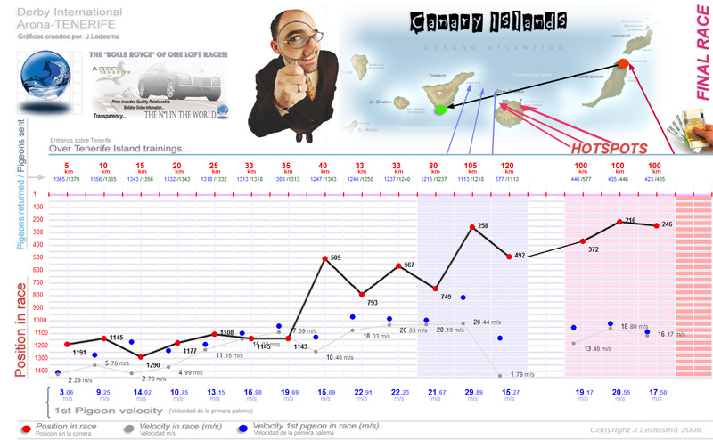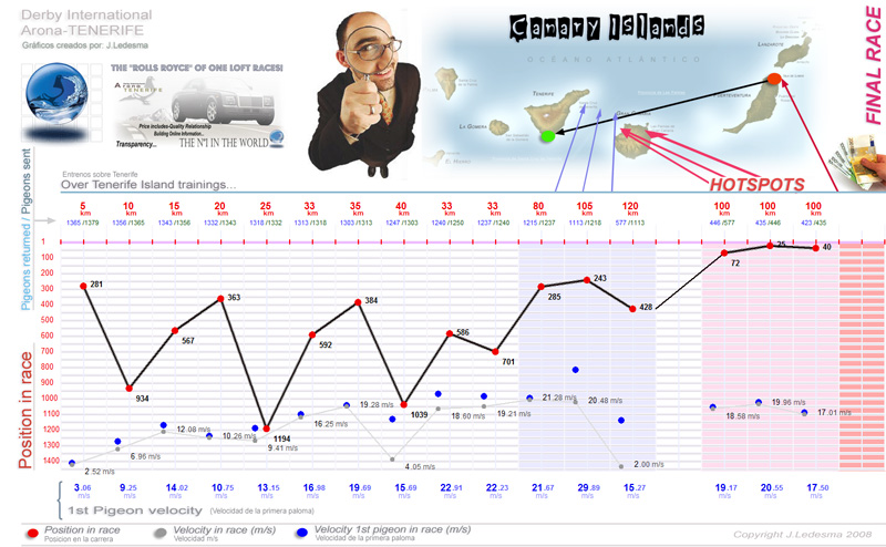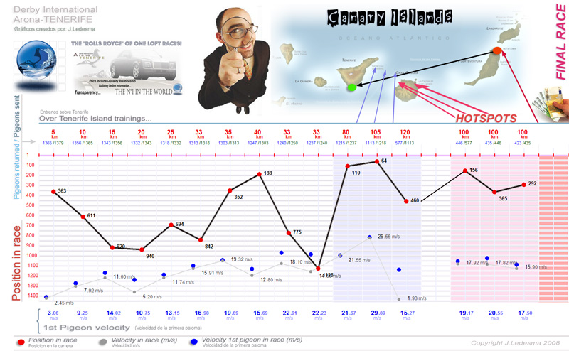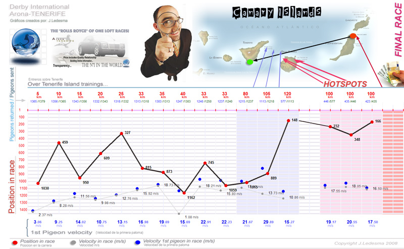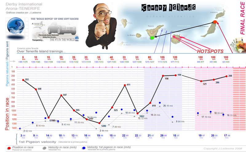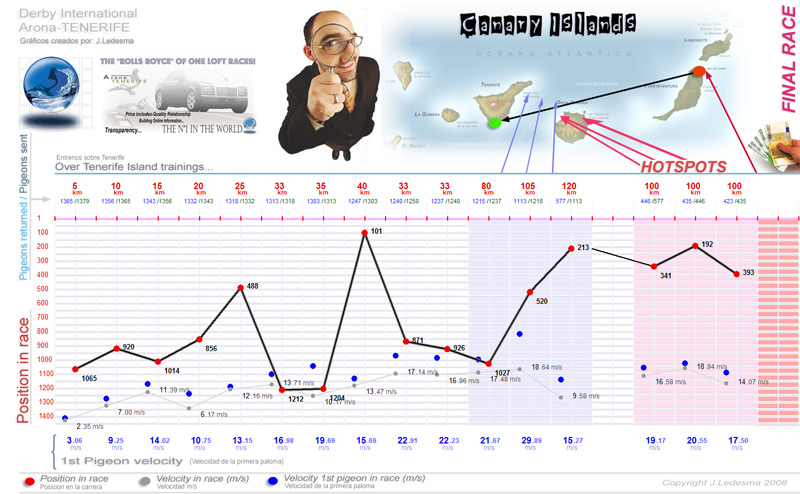 | Date / Time (Fecha / Hora) | Race (Concurso) | Arrival (Llegada) | Time / Speed (Tiempo / Vel) | Pigeon sent (Soltadas) | Classification | WD | WS | TE | Sky (Cielo) |
