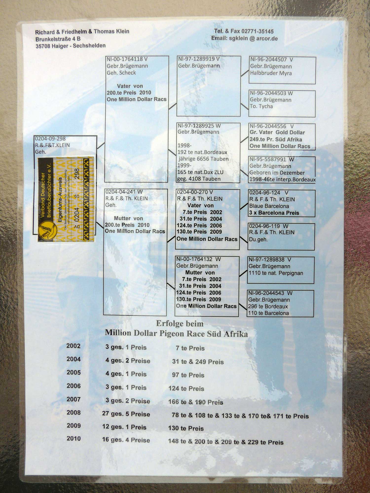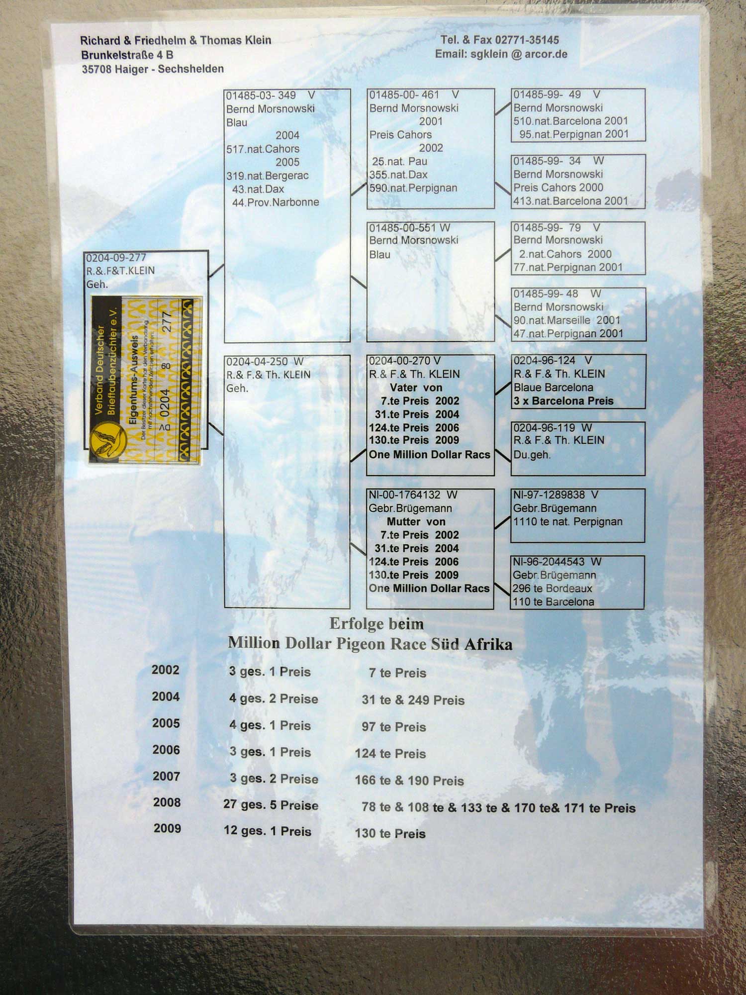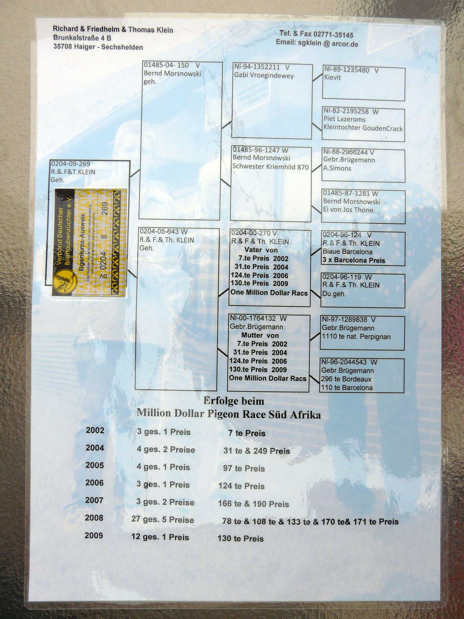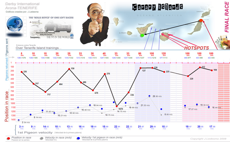 | Date / Time (Fecha / Hora) | Race (Concurso) | Arrival (Llegada) | Time / Speed (Tiempo / Vel) | Pigeon sent (Soltadas) | Classification | WD | WS | TE | Sky (Cielo) |