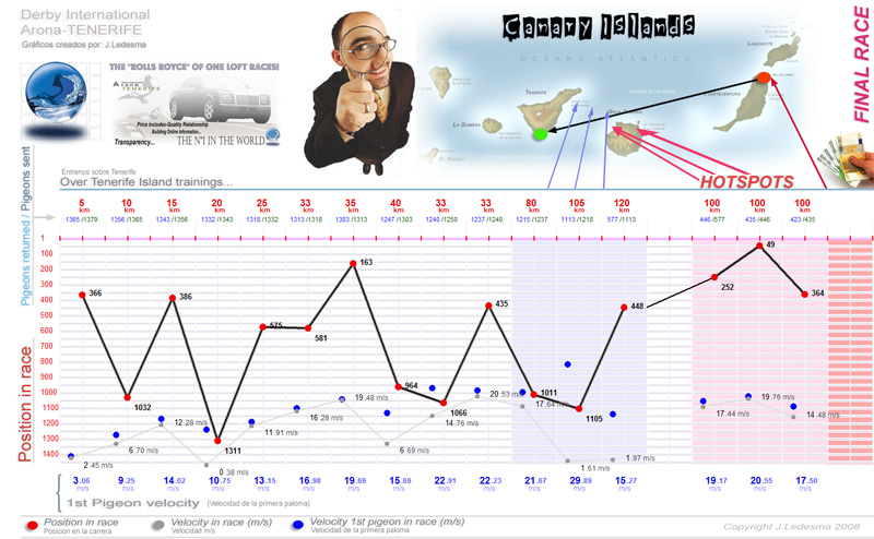 | Date / Time (Fecha / Hora) | Race (Concurso) | Arrival (Llegada) | Time / Speed (Tiempo / Vel) | Pigeon sent (Soltadas) | Class. | WD | WS | TE | Sky (Cielo) | Score |